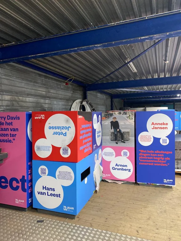 Deze kubussen zijn gemaakt voor een reizende tentoonstelling van de VN (buiten). Sommige kubussen hebben balken aan de onderkant zitten waardoor ze gemakkelijk te verplaatsen zijn met een pompwagen. De kubussen zijn gestickerd. Het beste kun je deze opnieuw laten stickeren, of inpakken wanneer de kubussen zichtbaar worden toegepast.
