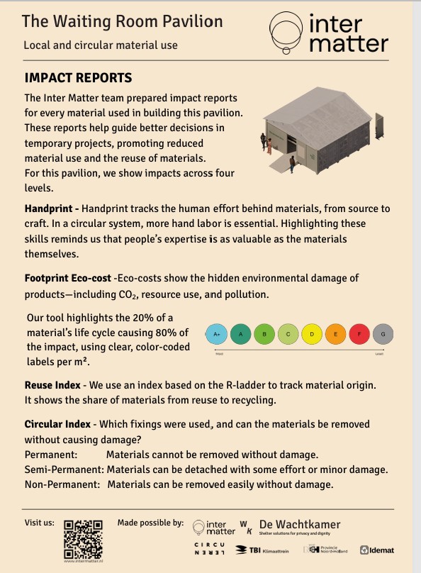 Na de Dutch Design Week is het Wachtkamer paviljoen klaar voor een tweede leven. Dit volledig circulaire en modulaire paviljoen van 6.4 x 6.4 m, zoekt een nieuwe locatie waar het opnieuw betekenis kan krijgen. Een plek waar het paviljoen kan fungeren als ontmoetingsruimte, werkplaats, educatieruimte, of tijdelijke expositieruimte. De constructie is volledig vervaardigd uit circulair afvalhout, geleverd door het Nederlandse bedrijf Herso Circulaire Houtbewerkers.