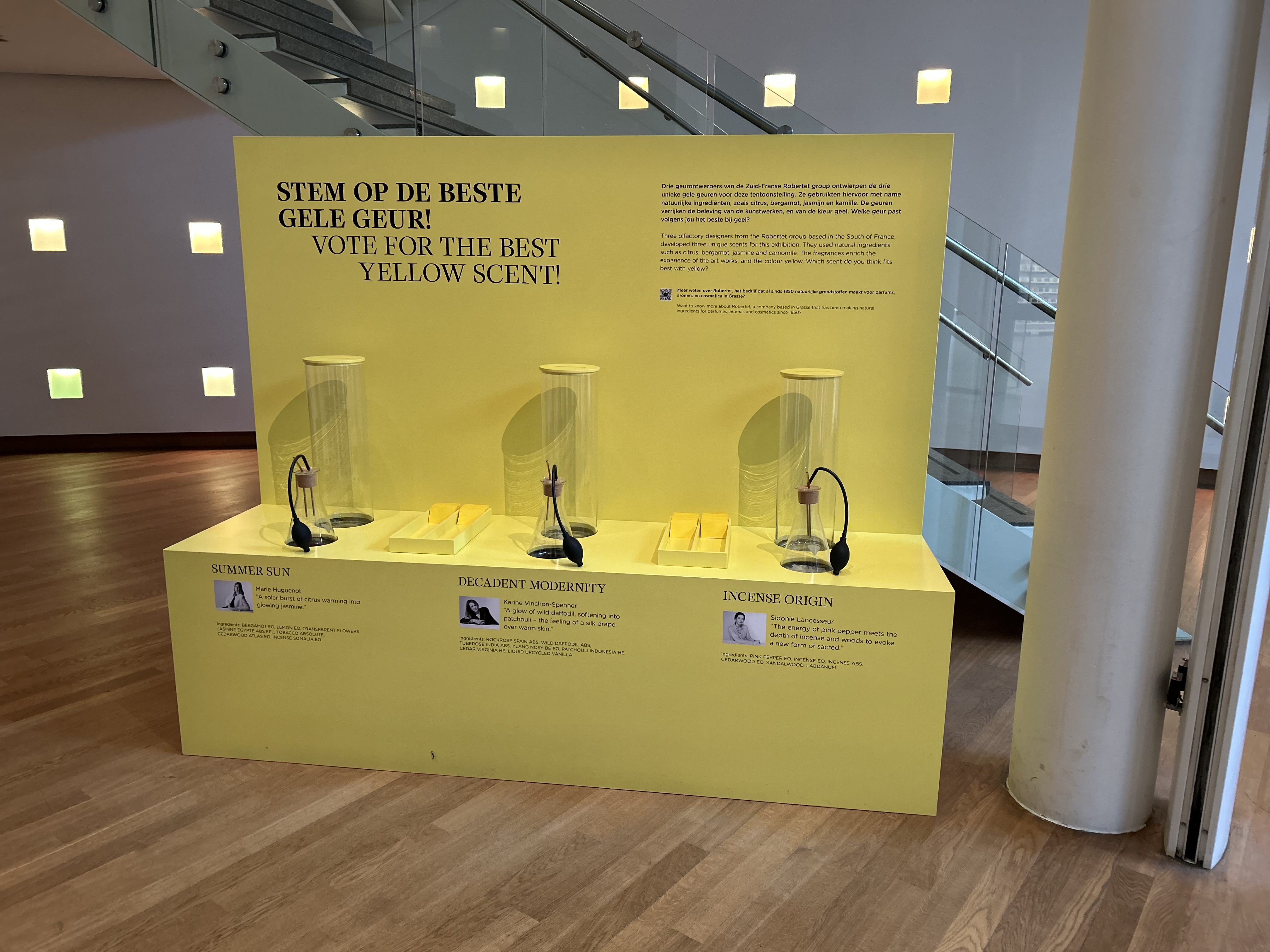 Display meubel met 3 glazen cilinders. Gebruikt als keuzemeubel om te stemmen op geuren. Verkoop zonder erlenmeyers. Totale hoogte 200 cm, hoogte blad 70 cm.