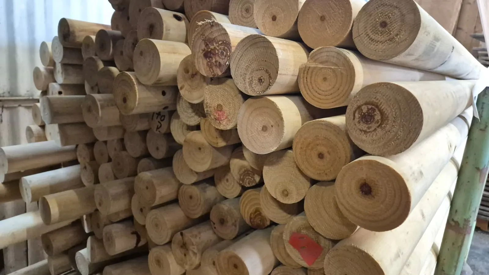 Deze grenen palen zijn een overblijfsel van de productie van fineer. De boomstam wordt afgeschild en de kern blijft over. Diameter is 68mm en de palen zijn 2,40 meter lang.