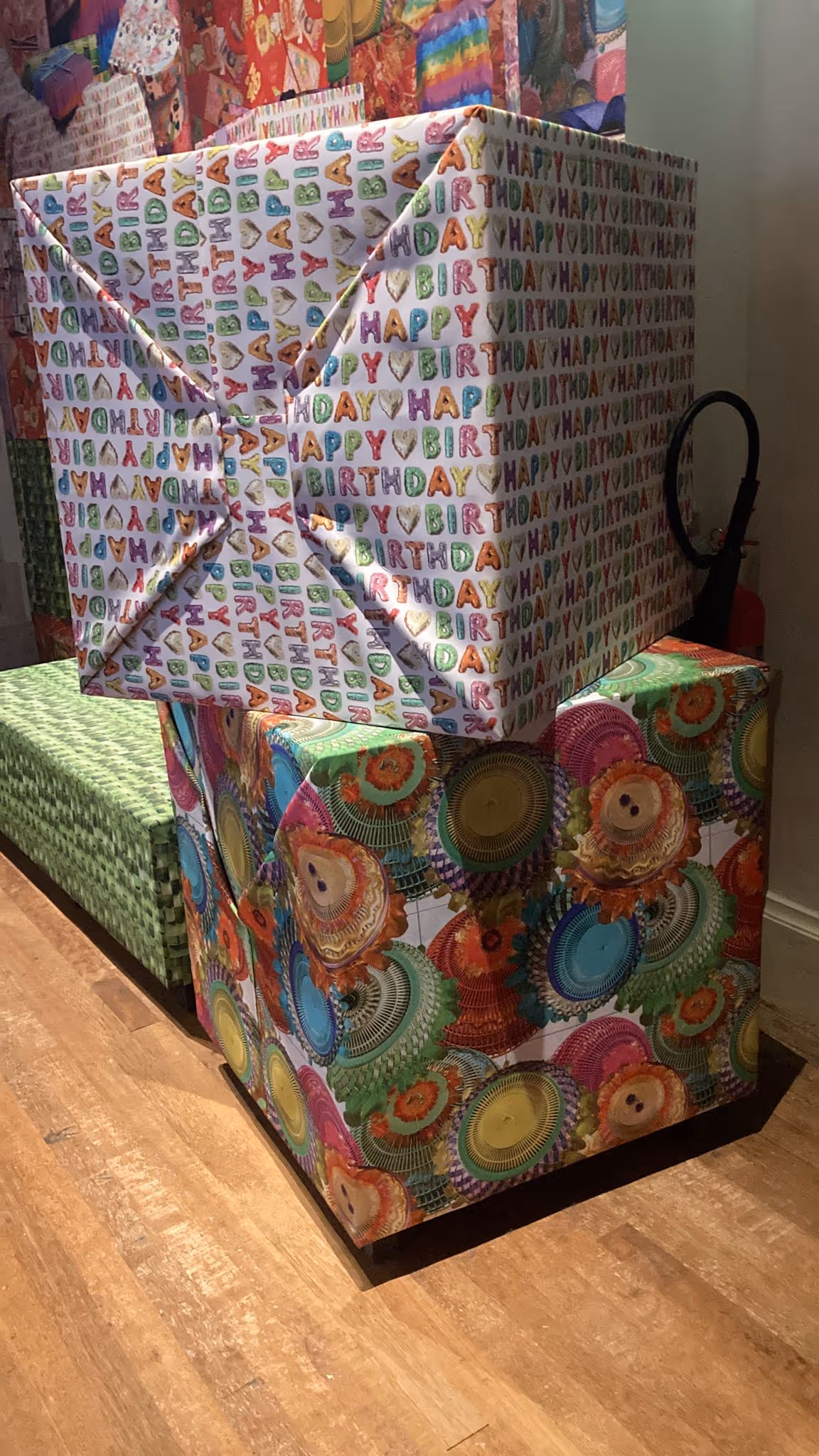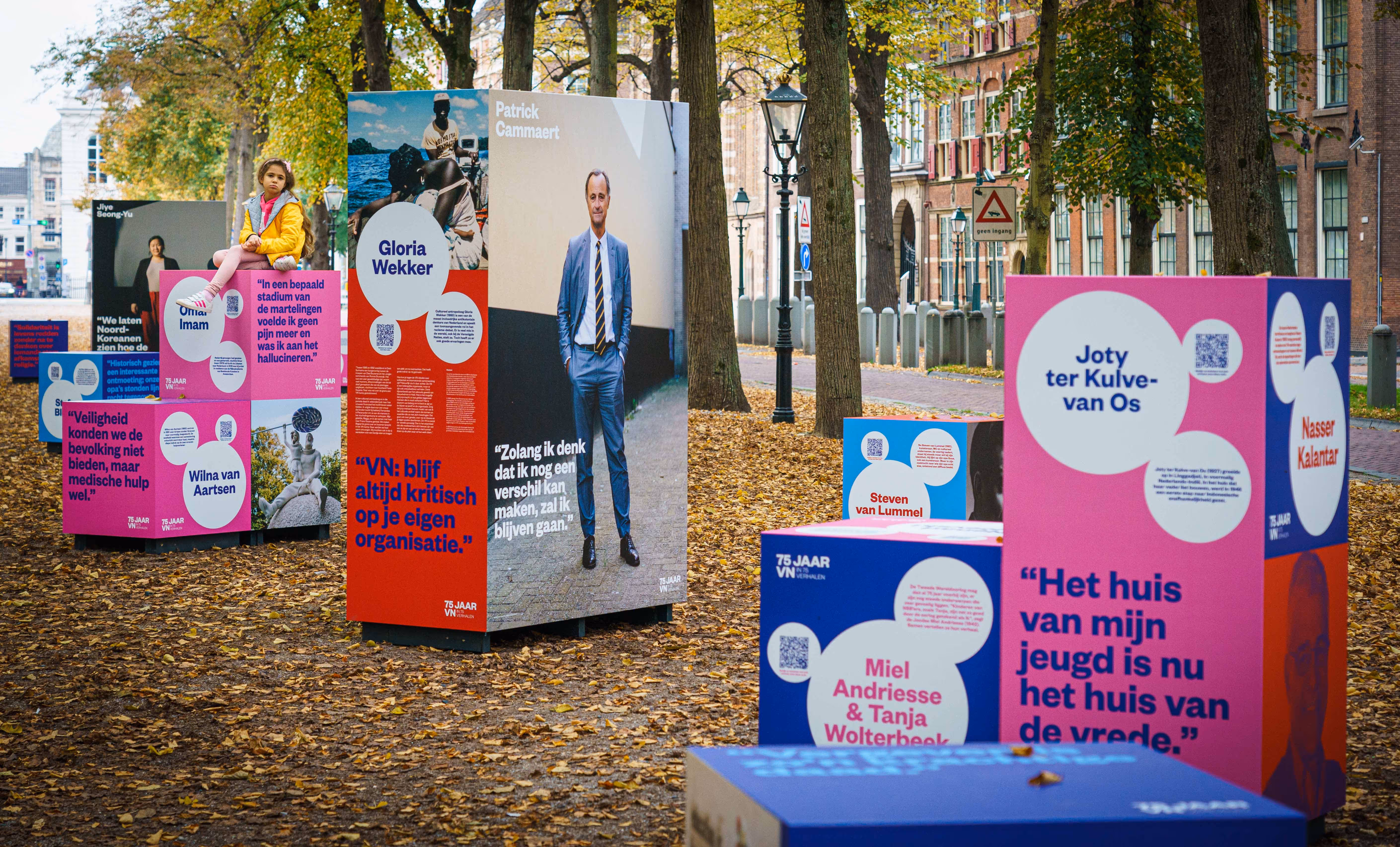 Deze kubussen zijn gemaakt voor een reizende tentoonstelling van de VN (buiten). Sommige kubussen hebben balken aan de onderkant zitten waardoor ze gemakkelijk te verplaatsen zijn met een pompwagen. De kubussen zijn gestickerd. Het beste kun je deze opnieuw laten stickeren, of inpakken wanneer de kubussen zichtbaar worden toegepast.